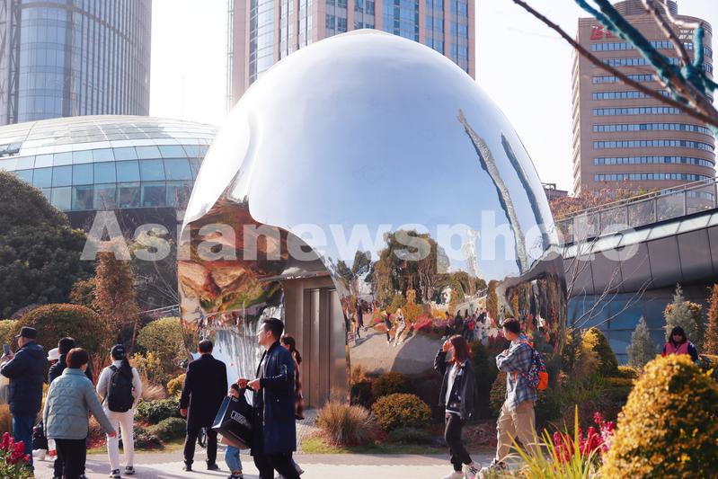 2022年2月27日,上海,北外滩滨江旅游景点人气随气温回升,市民游客漫游在黄浦江畔水晶球绿化带。