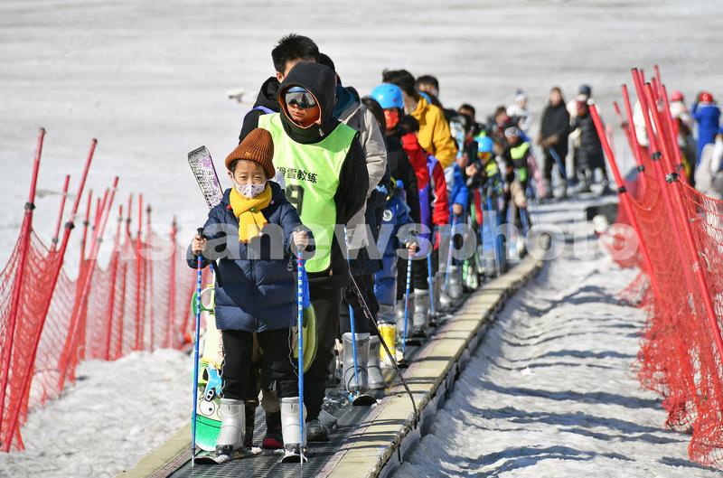 图片说明:2022年2月27日,游客在山东省烟台市南里必捷滑雪公园体验滑雪。