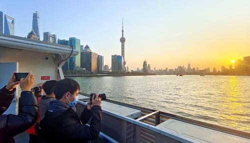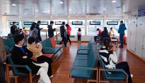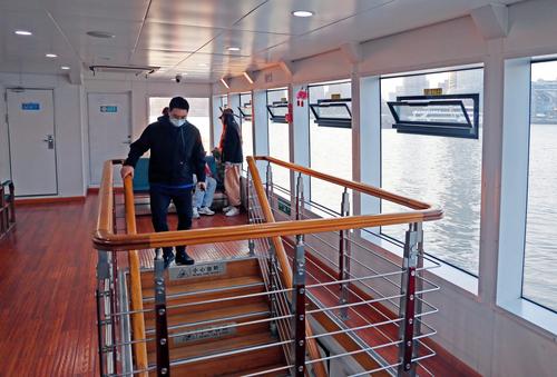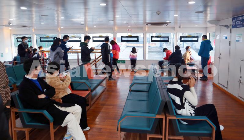 图片说明:2022年2月27日,上海,众多乘客坐黄浦江轮渡从浦西北外滩的公平路渡口摆渡到浦东陆家嘴的泰同栈渡口。