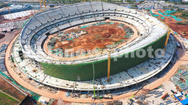 2022年3月2日,江西省赣州市蓉江新区,赣州市全民健身中心项目工地,工人在进行体育场主体结构收尾施工。
