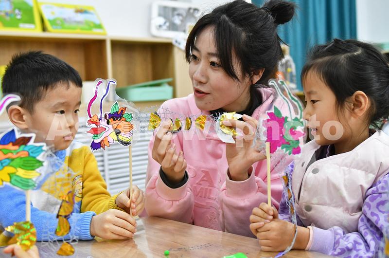 2022年3月3日,山东省烟台市福山区福苗幼儿园的小朋友们在制作“龙抬头”玩具。