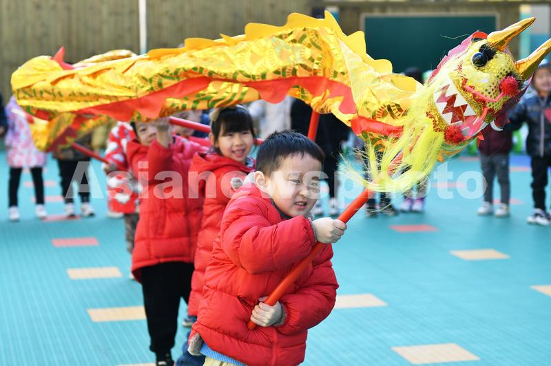 2022年3月3日,山东省烟台市福山区福苗幼儿园的小朋友们在表演舞龙。