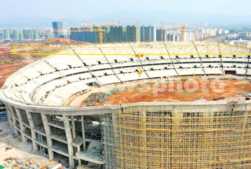 2022年3月2日,江西省赣州市蓉江新区,赣州市全民健身中心项目工地,工人在进行体育场主体结构收尾施工。