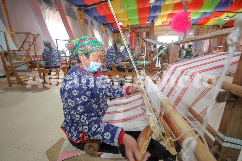 2022年3月4日,在山西省永济市开张镇东开张村惠畅土布文化旅游产业园,纺织艺人在织布纺线车间忙碌。