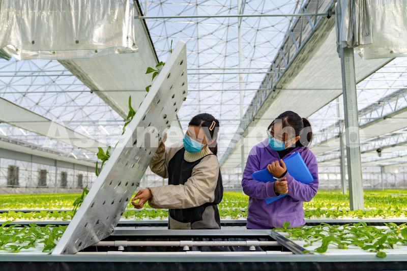 2022年3月3日,安徽省合肥市肥东县桥头集镇安徽现代雾耕农业科技示范园植物工厂温室内,安徽农业大学作物栽培学与耕作学硕士毕业的李媛(右)和安徽农业大学设施农业科学与工程专业本科毕业的陈瑞在观察记录气雾栽培的蔬菜根系生长情况。