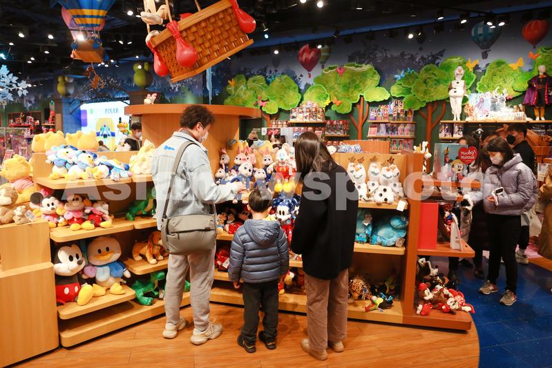 2022年2月27日,上海,家长带着孩子来迪士尼中国首家旗舰店内选购毛绒玩偶。
