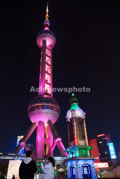 2022年2月27日,上海,迪士尼中国首家旗舰店外的童话王国城堡钟楼,到了夜晚举办灯光秀表演,与浦东陆家嘴东方明珠夜景和谐交融。
