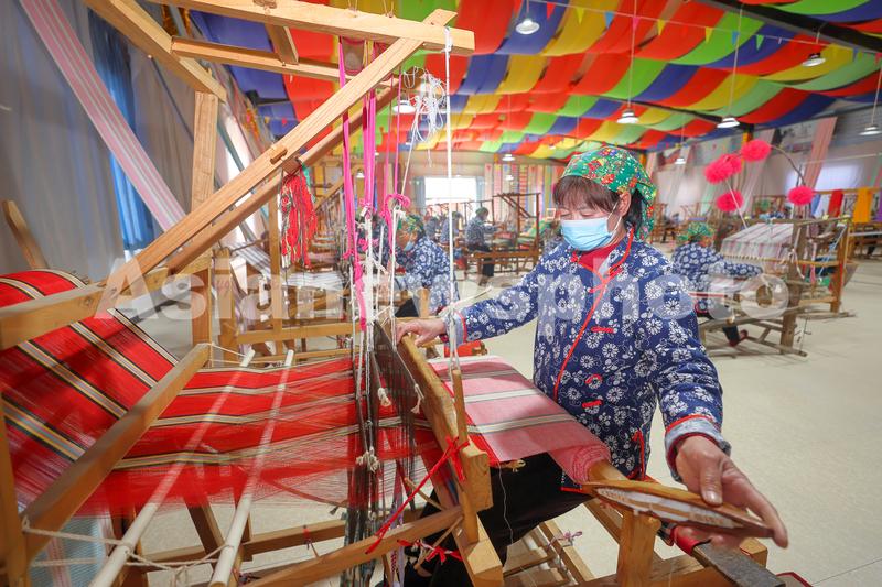 2022年3月4日,在山西省永济市开张镇东开张村惠畅土布文化旅游产业园,纺织艺人在织布纺线车间忙碌。