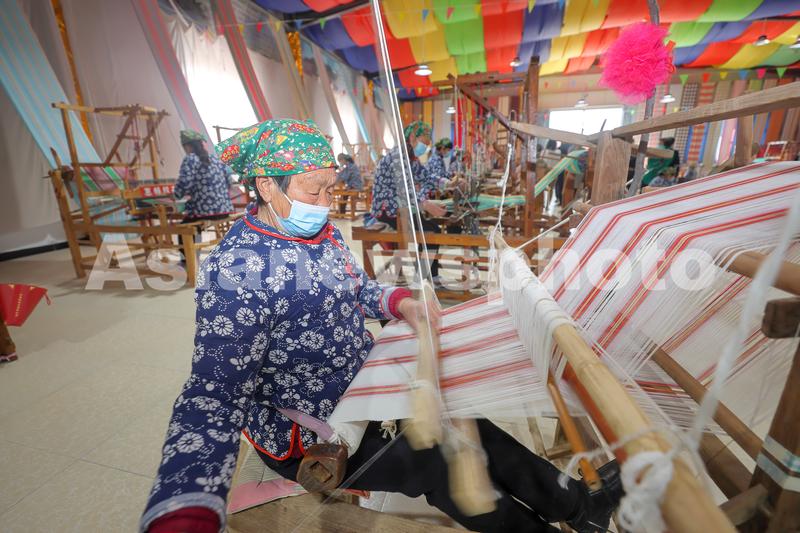 2022年3月4日,在山西省永济市开张镇东开张村惠畅土布文化旅游产业园,纺织艺人在织布纺线车间忙碌。
