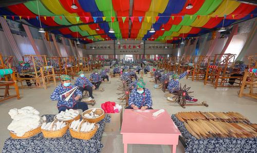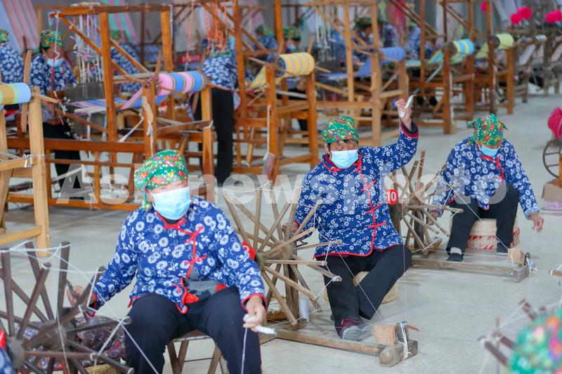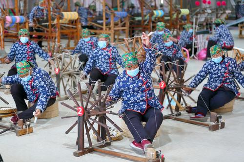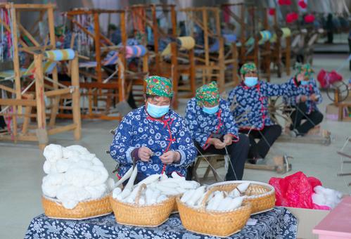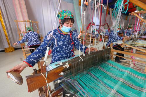 2022年3月4日,在山西省永济市开张镇东开张村惠畅土布文化旅游产业园,纺织艺人在织布纺线车间忙碌。
