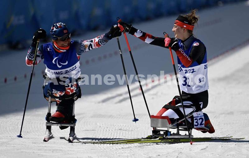 图片说明:3月6日,一名加拿大选手与一名挪威选手抵达终点后庆祝.