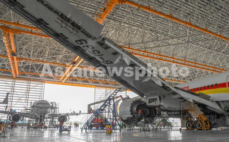 2022年3月6日,在海南省海口市海口空港综合保税区一站式飞机维修基地(一期)的一号大修定检机库,工作人员正在紧张有序的为飞机进行定检维修。