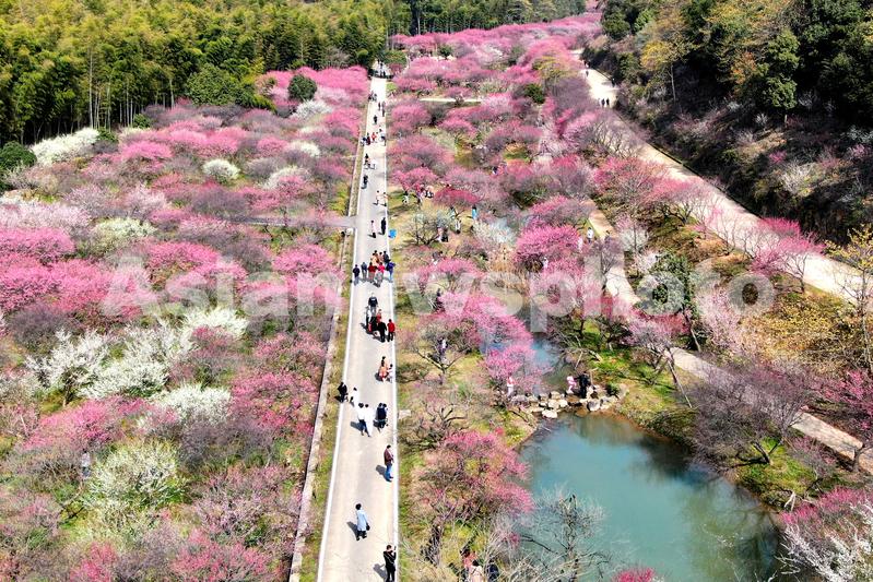 图片说明:2022年3月5日,浙江省湖州市长兴县龙山街道川步村梅花坞,东方梅园梅花竞相盛开,吸引游人踏春赏花。