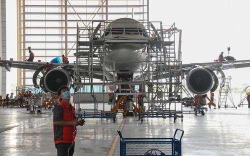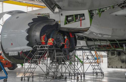 图片说明:2022年3月6日,在海南省海口市海口空港综合保税区一站式飞机维修基地(一期)的一号大修定检机库,工作人员正在紧张有序的为飞机进行定检维修。