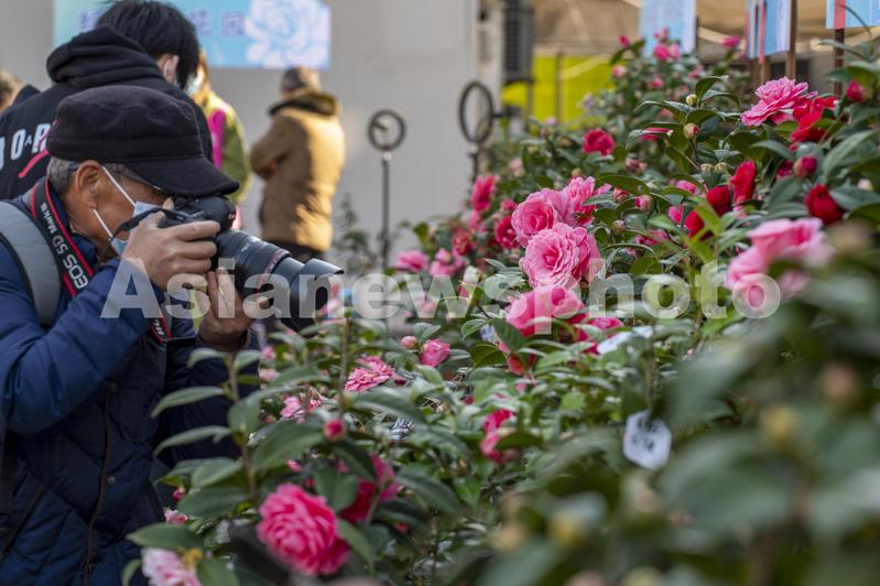 图片说明:2022年3月9日,浙江省金华市婺城区竹马乡下张家村,朵朵茶花盛开,吸引游客围观拍照。