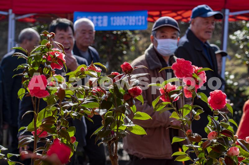 图片说明:2022年3月9日,浙江省金华市婺城区竹马乡下张家村,朵朵茶花盛开,吸引游客围观。
