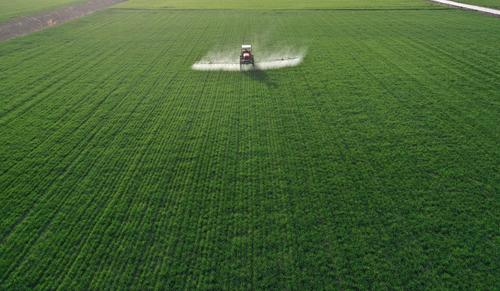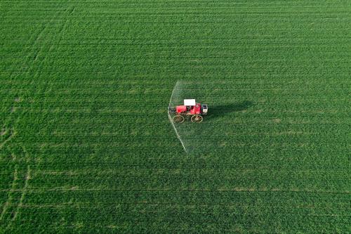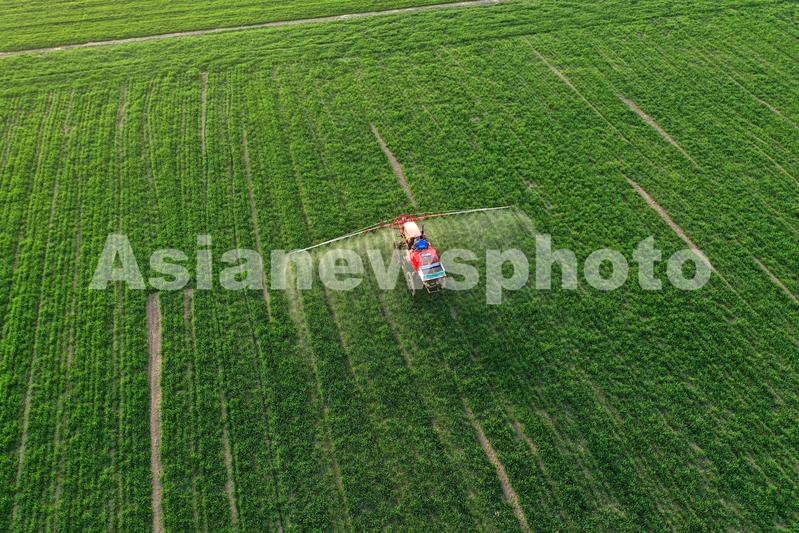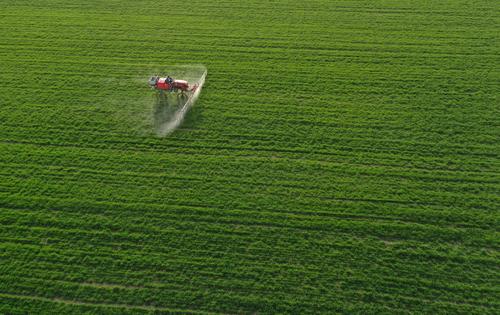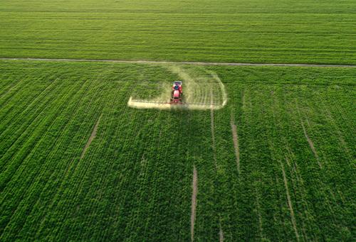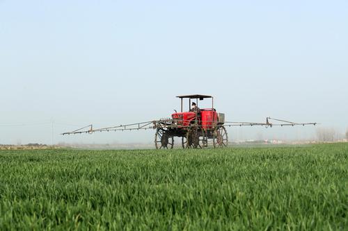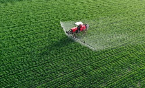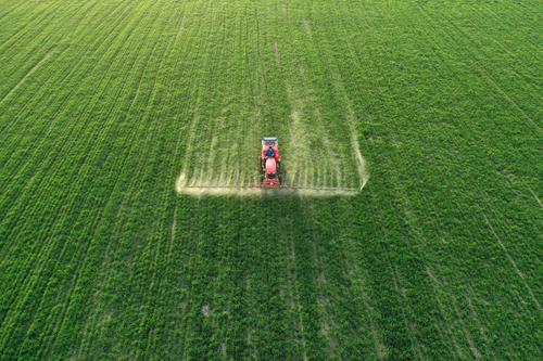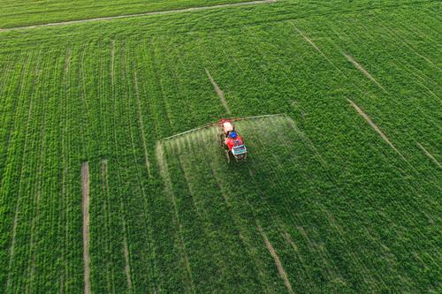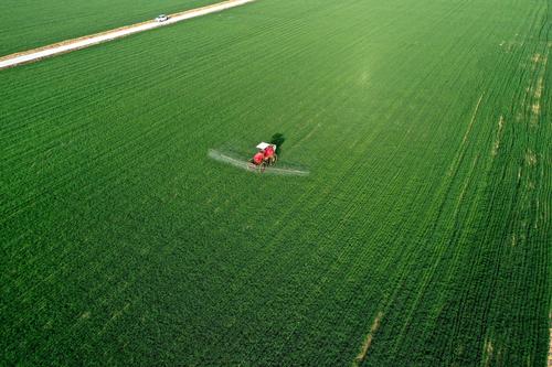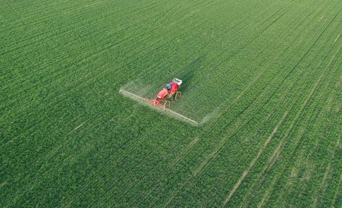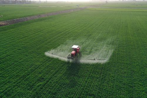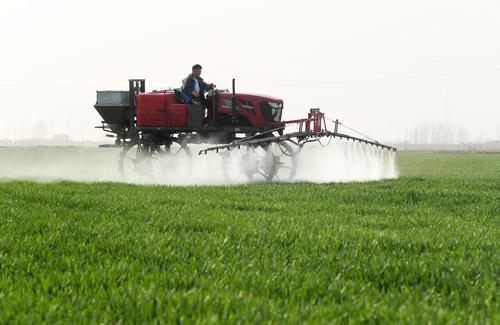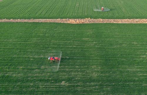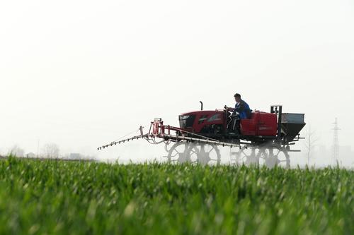 图片说明:2022年3月8日,安徽省蒙城县双涧镇农民驾驶植保机械为小麦田进行喷洒药物作业。