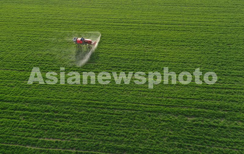 图片说明:2022年3月8日,安徽省蒙城县双涧镇农民驾驶植保机械为小麦田进行喷洒药物作业。