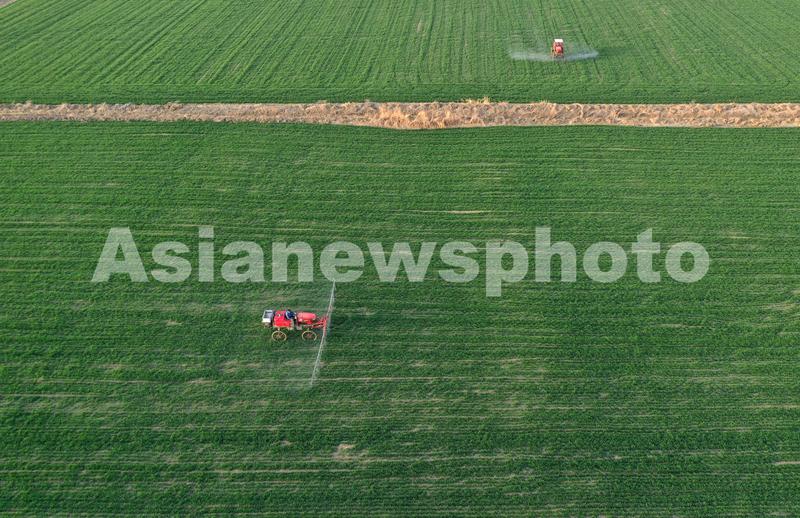 图片说明:2022年3月8日,安徽省蒙城县双涧镇农民驾驶植保机械为小麦田进行喷洒药物作业。