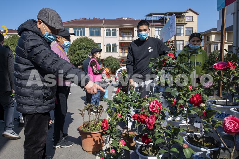 图片说明:2022年3月9日,浙江省金华市婺城区竹马乡下张家村,朵朵茶花盛开,吸引各地客商采购。