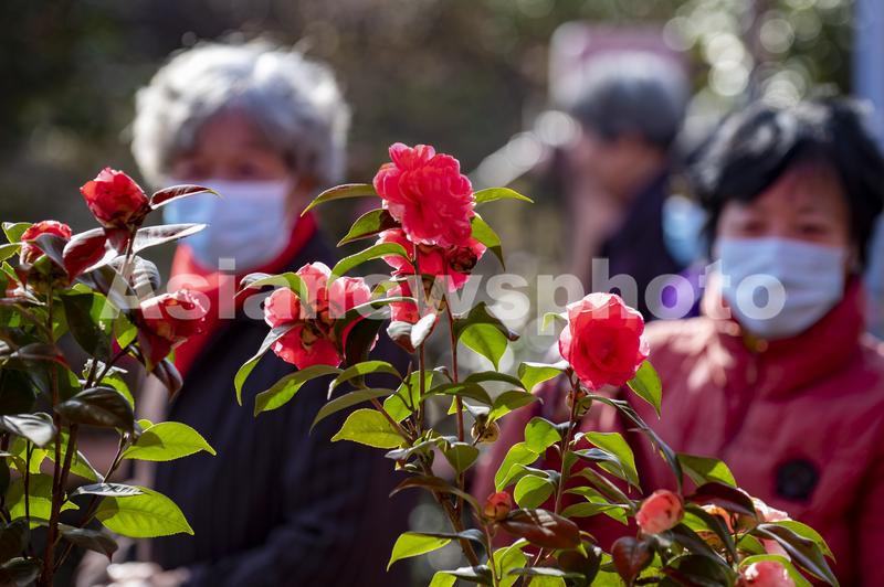 图片说明:2022年3月9日,浙江省金华市婺城区竹马乡下张家村,朵朵茶花盛开,吸引游客围观。