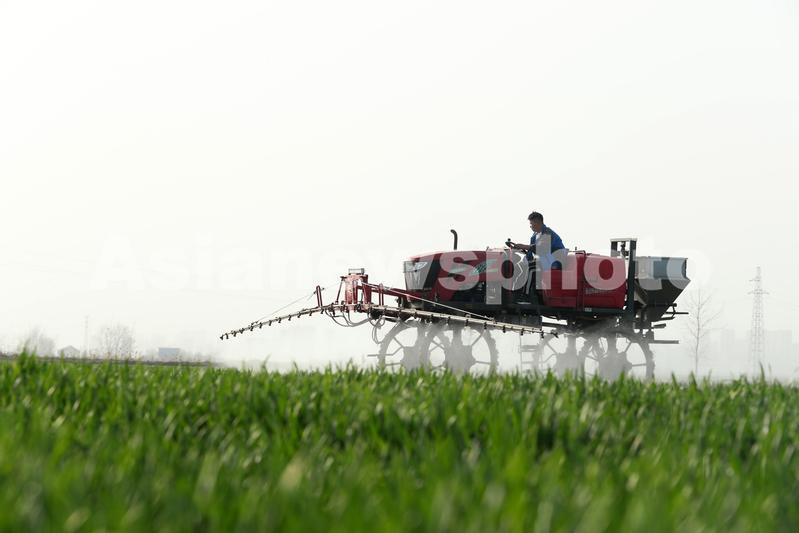 图片说明:2022年3月8日,安徽省蒙城县双涧镇农民驾驶植保机械为小麦田进行喷洒药物作业。