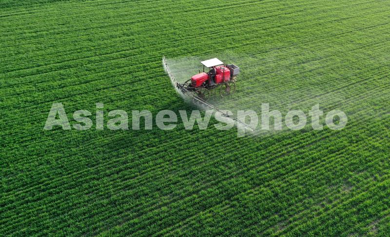 图片说明:2022年3月8日,安徽省蒙城县双涧镇农民驾驶植保机械为小麦田进行喷洒药物作业。