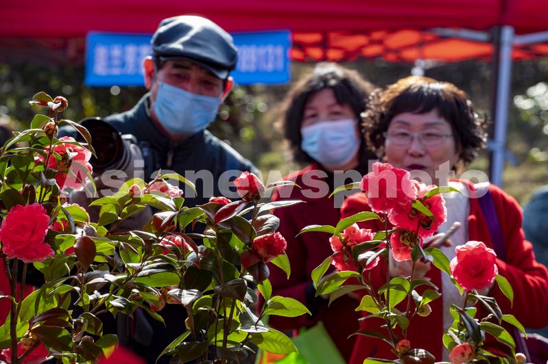 图片说明:2022年3月9日,浙江省金华市婺城区竹马乡下张家村,朵朵茶花盛开,吸引游客围观。