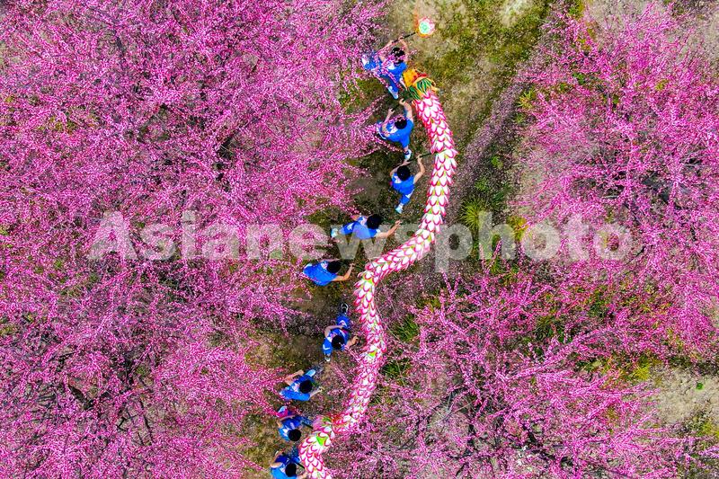 图片说明:2022年3月10日,浙江省湖州市长兴县林城镇,天平中心小学学生们在梅林中舞起当地非遗民俗“百叶龙”。