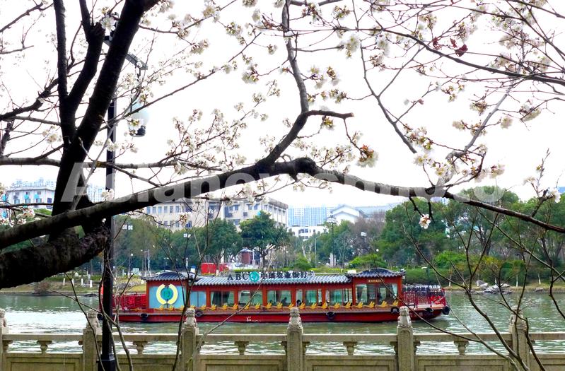 3月10日,一艘游船从早樱花掩映的苏州环城河水面上驶过。