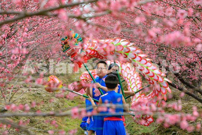 图片说明:2022年3月10日,浙江省湖州市长兴县林城镇,天平中心小学学生们在梅林中舞起当地非遗民俗“百叶龙”。