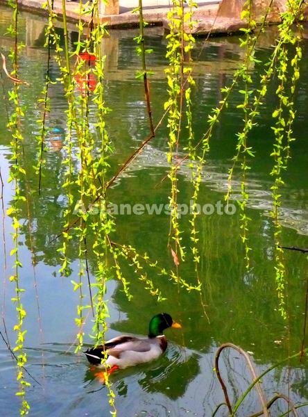 3月10日,一只绿头鸭在丝丝绿柳如帘的苏州可园池塘游弋。