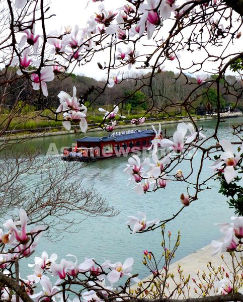 3月10日,一艘仿古游船在玉兰花簇拥的苏州环城河上行驶。