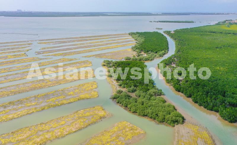 2022年3月10日,俯瞰位于海口市江东新区的海南东寨港国家级自然保护区生态修复和资源保护项目现场,一道道栽满了红树幼苗的海滩,如根根“琴弦”将两片红树林灌木丛连接一起,焕发出春天里新的活力和生机。