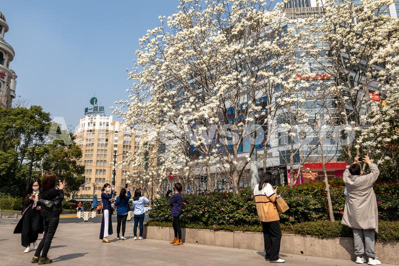 2022年3月11日,上海,人民广场西藏中路沿线的大片白玉兰目前进入了盛花期,洁白的花卉层层叠叠煞是好看,吸引众多民众驻足欣赏和拍照。