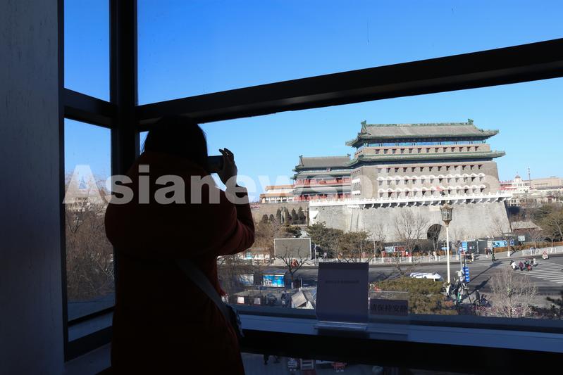 图片说明:2022年2月2日,游客从一家书店内观看拍摄正阳门。