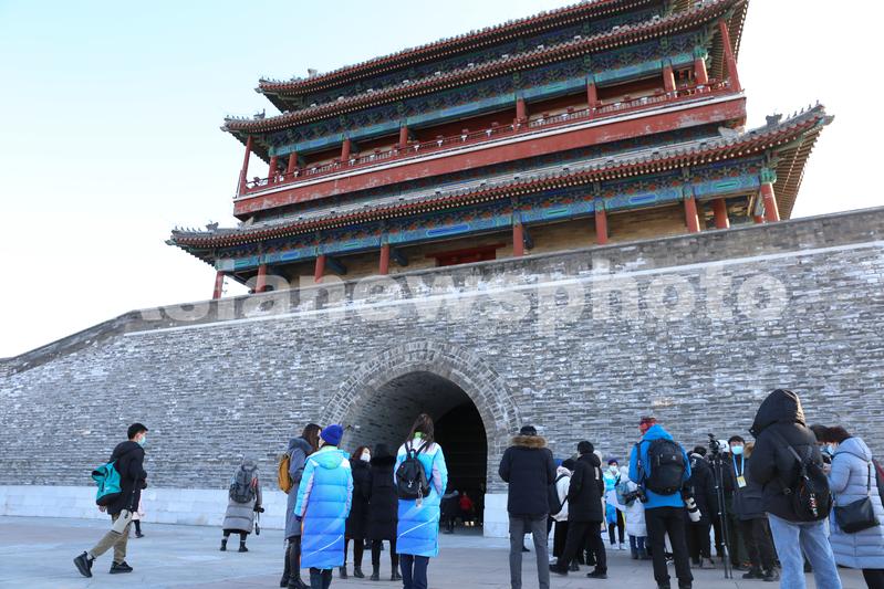 2022年2月1日,2022北京新闻中心组织的“古都文脉 北京最美中轴线”主题城市采访活动中,媒体记者及冬奥城市志愿者参观永定门城楼。