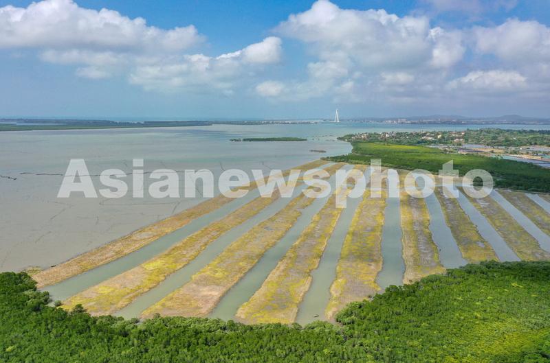2022年3月10日,俯瞰位于海口市江东新区的海南东寨港国家级自然保护区生态修复和资源保护项目现场,一道道栽满了红树幼苗的海滩,如根根“琴弦”将两片红树林灌木丛连接一起,焕发出春天里新的活力和生机。