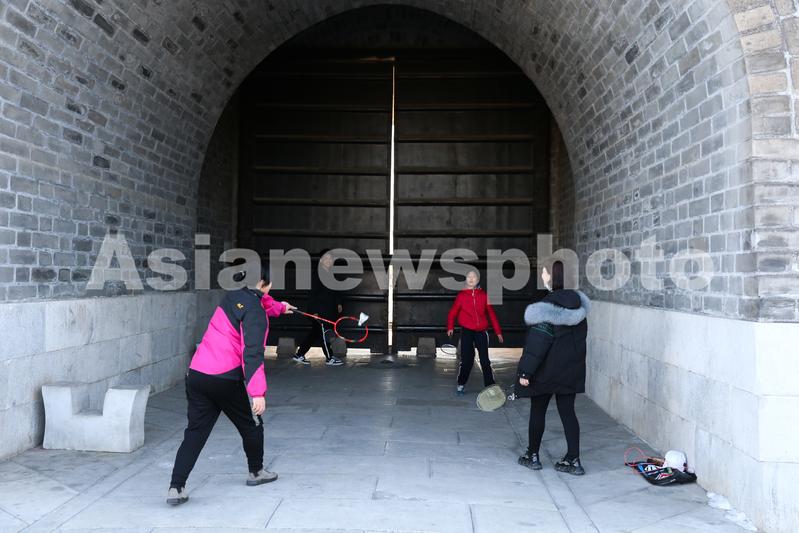 2022年2月1日,永定门城楼下,市民在打羽毛球。