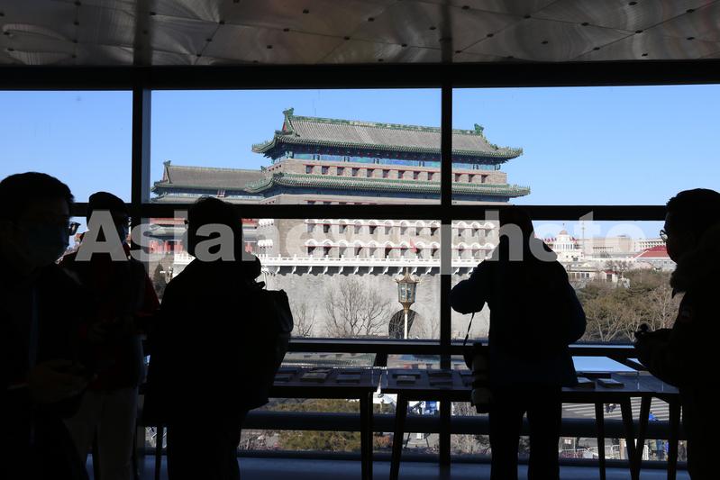 2022年2月2日,游客从一家书店内观看拍摄正阳门。