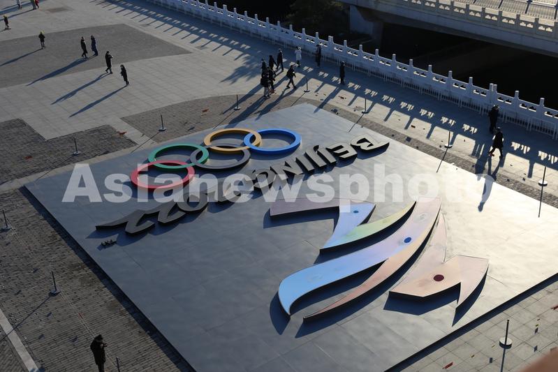 2022年2月1日,北京,永定门城楼上拍摄的北京冬奥会会徽标识。