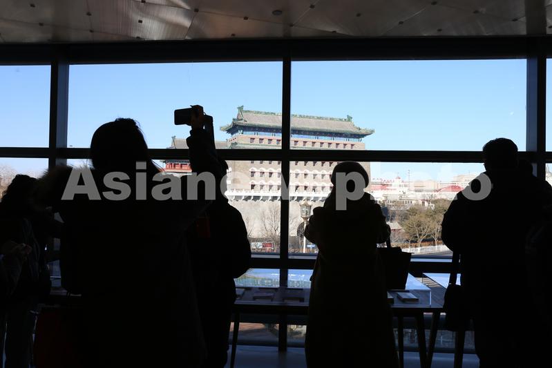 2022年2月2日,游客从一家书店内观看拍摄正阳门。