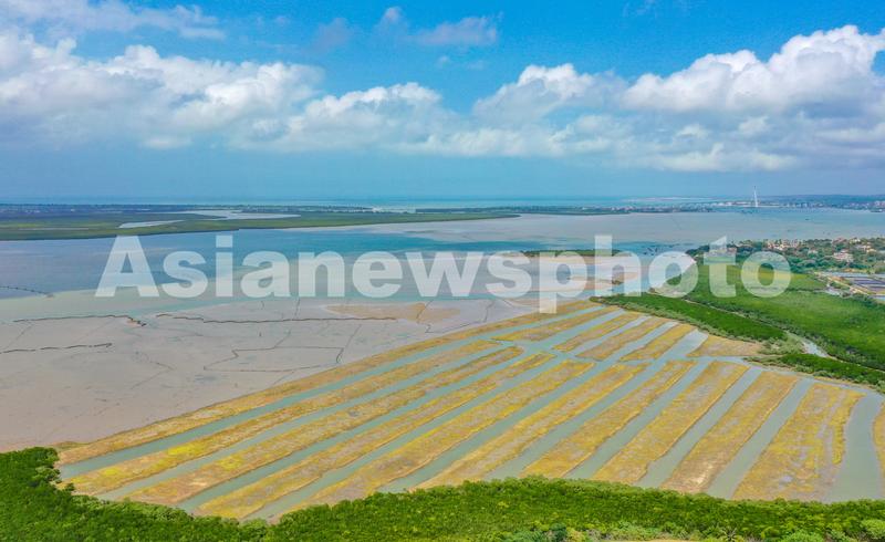 2022年3月10日,俯瞰位于海口市江东新区的海南东寨港国家级自然保护区生态修复和资源保护项目现场,海滩栽满了红树幼苗。