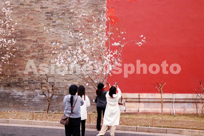 2022年3月11日,北京,游客在故宫筒子河东华门到午门区域宫墙外的玉兰花旁拍照留念。