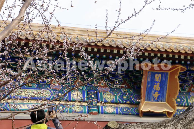 2022年3月13日,北京北海公园阐福寺门前,山桃花烂漫绽放,吸引游客关注。
