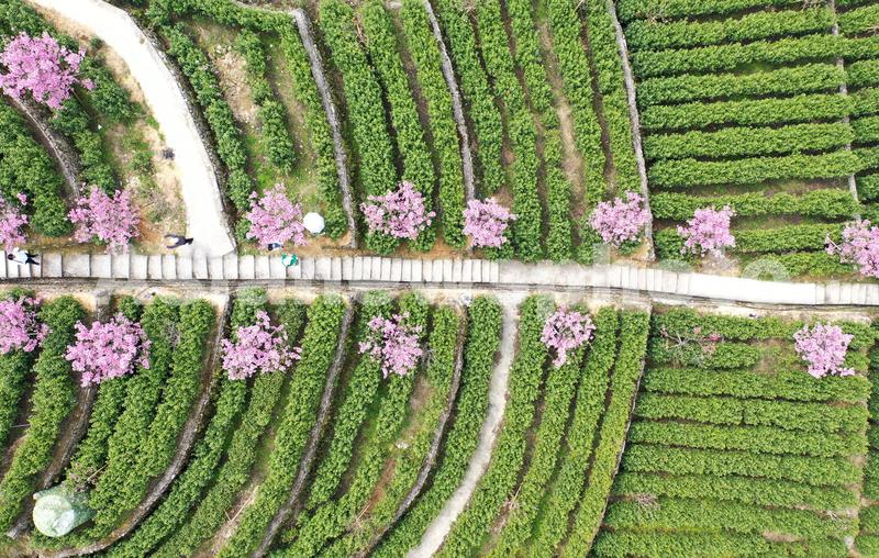 图片说明:2022年3月13日,游客在浙江省乐清市岭底乡九龙山茶场赏花拍照。