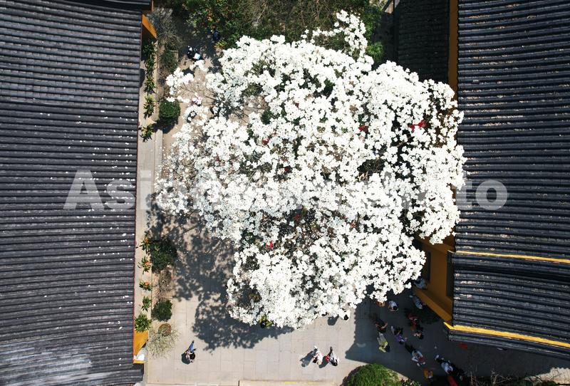 图片说明:2022年3月14日,市民游客在位于杭州西湖区的法喜寺内观看500多年树龄古玉兰树盛开的玉兰花。
