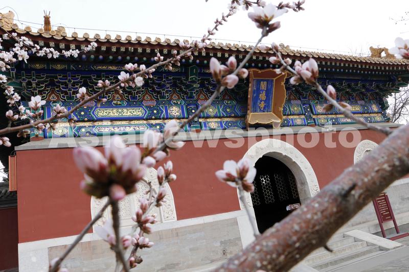 2022年3月13日,北京北海公园阐福寺门前,山桃花绽放。