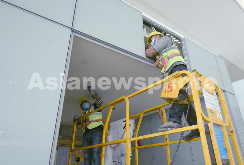 图片说明:2022年3月15日,工人在杭州萧山国际机场T4航站楼进行施工。