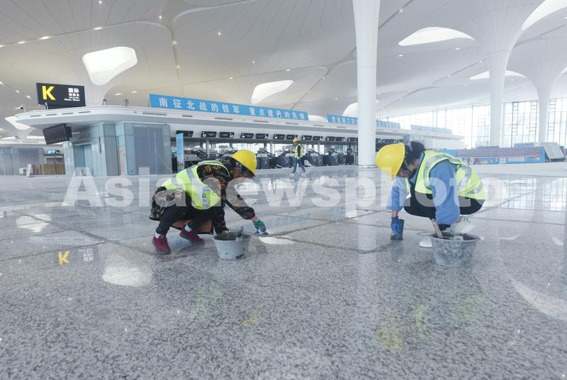 图片说明:2022年3月15日,工人在杭州萧山国际机场T4航站楼进行施工。